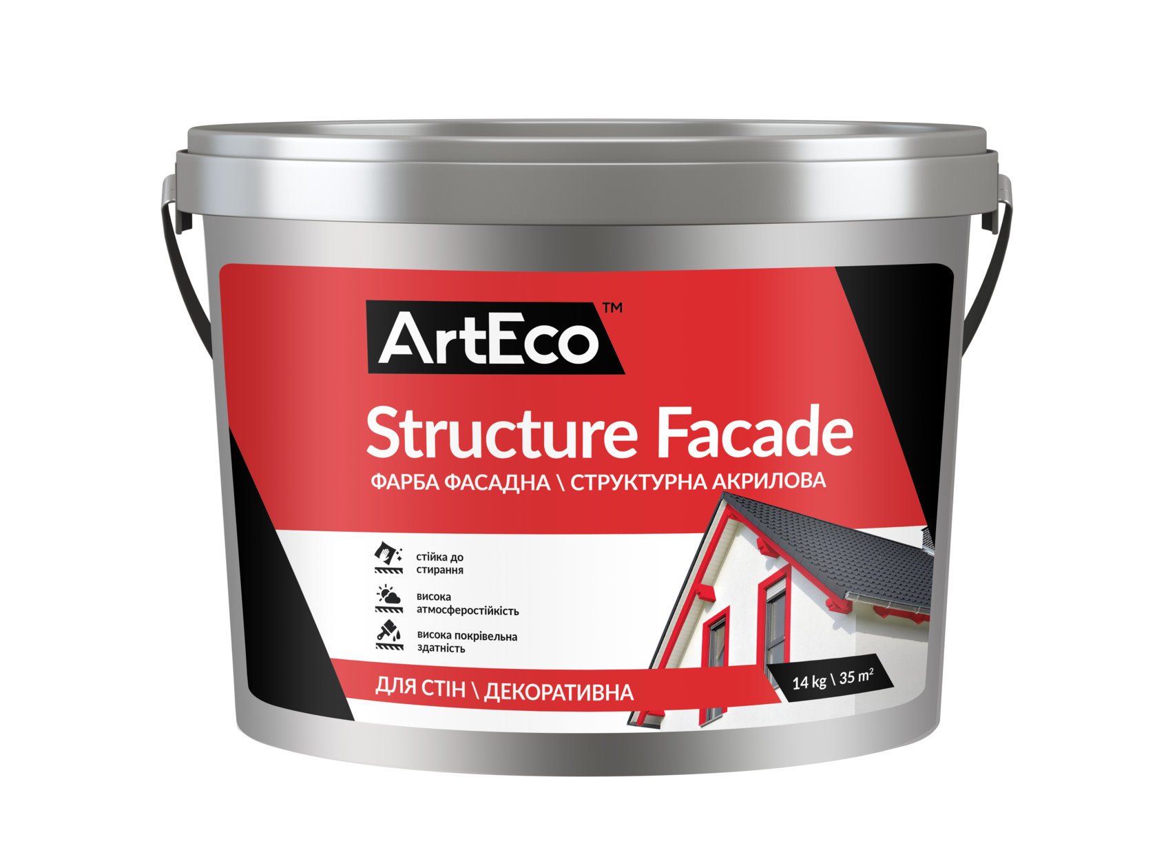 Без специфічного запаху та вмісту токсичних речовин. Зручно наноситься, добре вкриває поверхню та приховує дрібні недоліки поверхні. Одержане покриття біле, рельєфне середньозернисте (розмір частинок S2 - менше 300 мкм), товщи-на сухої плівки Е3 – не менше 100 мкм), стійке до багаторазового миття неабразивними миючими засобами, а також до появи водоростей, плісняви та грибків.
