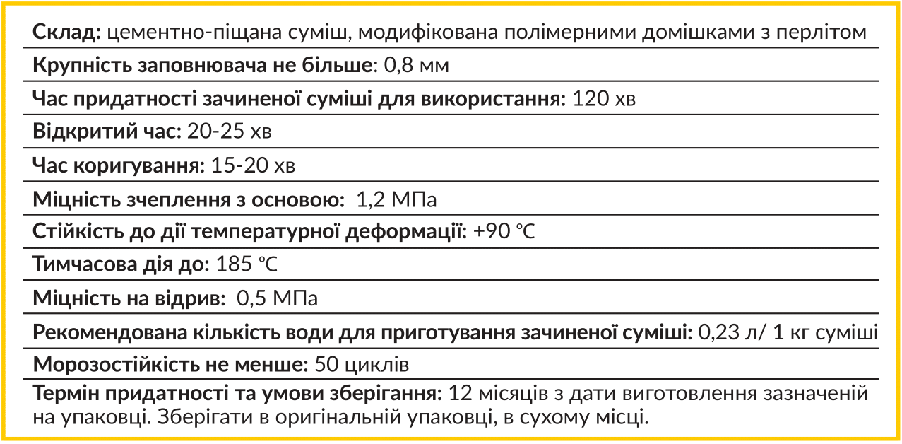 Суміш будівельна суха модифікована призначена для облицювання стін і підлог плиткою з природного та штучного матеріалів по основах, що деформуються всередині та зовні приміщень. Ефективно використовувати для улаштування теплих підлог, сходів та облицювання камінів.