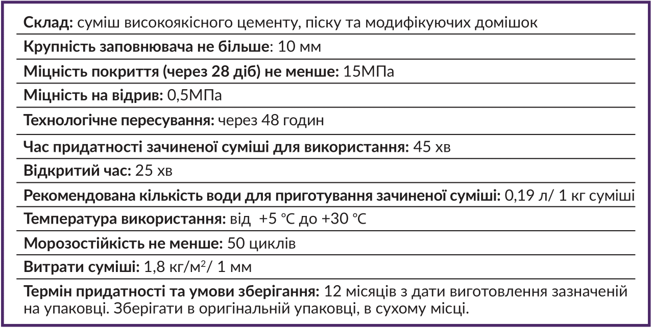 Суміш будівельна суха модифікована призначена для вирівнювання бетоних основ і стяжок із цементно-піщаних розчинів під помірні навантаження для подальшого облаштування фінішних покриттів (лінолеум, ковролін, ламінат, паркет, керамічна плитка та інших облицювальних матеріалів) всередині будівель.