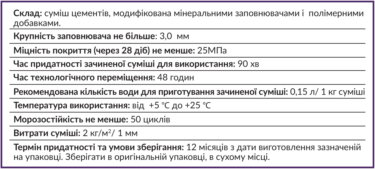 Суміш будівельна суха модифікована призначена для влаштування міцних стяжок по жорстких основах під подальше нанесення самовирівнюючих сумішей; влаштування систем водних і електричних «теплих підлог»; ремонту тріщин та вибоїн, усунення нерівностей та перепадів основ.